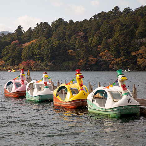 芦ノ湖では、足こぎスワンボートに乗るのもおすすめです。湖上でのんびりと、自然に癒されながら楽しい湖めぐり。レトロで愛嬌のあるスワンの姿は、芦ノ湖の名物にもなっています。RoheNから徒歩約8分。